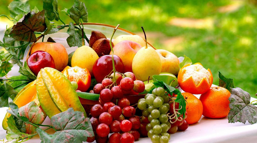 виноградные гроздья, арбузы, груши и дыни.