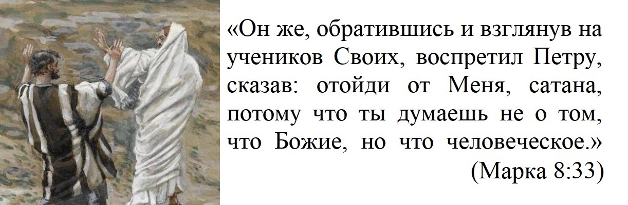 «Он же, обратившись и взглянув на учеников Своих, воспретил Петру, сказав: отойди от Меня, сатана, потому что ты думаешь не о том, что Божие, но что человеческое.» (Марка 8:33)