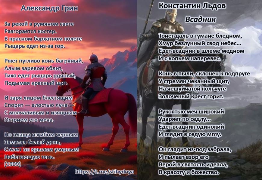 Главным различием является время суток (и задаваемое им цветовое решение стиха). У Льдова всадник едет безлунной ночью, у Грина рыцарь является с зарёй (и даже спорит с ней обликом). Но мы вполне можем думать, что это один и тот же всадник. В серой мгле ночи ярко горит золотой крест, в алом свете зари не остаётся места для других красок. Ночь кончилась, наступило утро, но тревога не улеглась. Всадник всё равно выступает вестником беды.