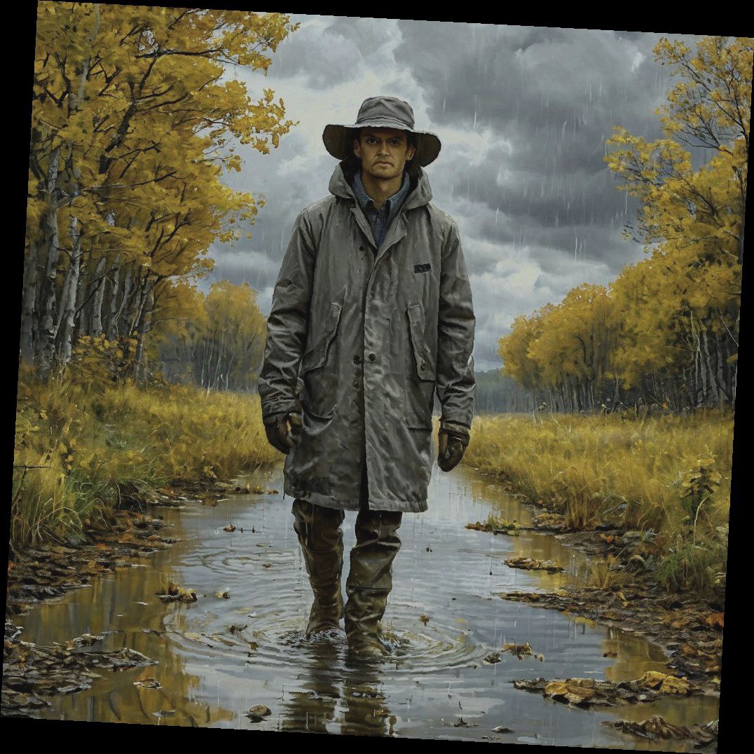 Стоит мужчина в серой шляпе,с её полей вода стекает.