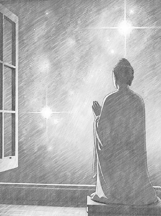 Будда смотрит в окно, где раскинулась звёздная твердь.