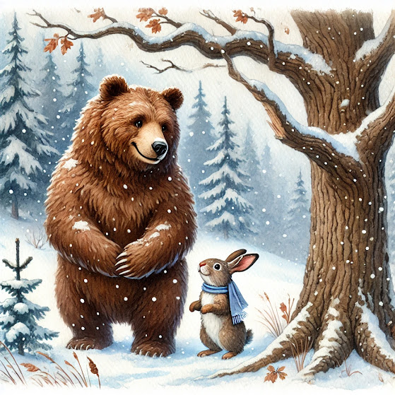 Наступила зима. Лес замело снегом, и стало совсем холодно. Медведь спокойно спал в своей теплой берлоге, а Заяц, стуча зубами от холода, вынужден был искать себе пропитание. Но однажды, когда он решил рискнуть и пробраться к старому дубу за остатками желудей, Заяц услышал знакомый рев — это был Медведь!