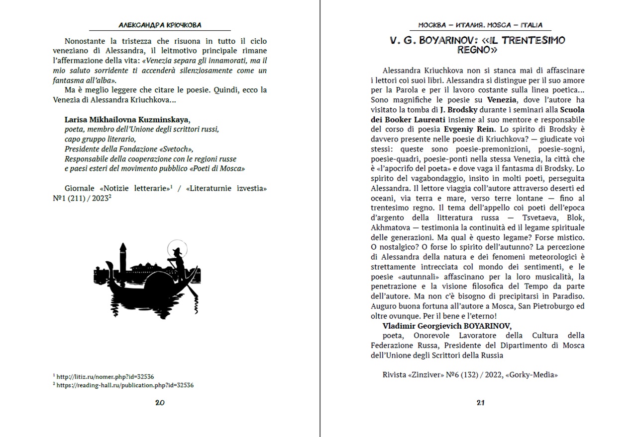 Lo spirito di Brodsky e` davvero presente nelle poesie di Kriuchkova? - giudicate voi stessi: queste sono poesie-premonizioni, poesie-sogni, poesie-quadri, poesie-ponti nella stessa Venezia, la citta` che e` “l’apocrifo del poeta” e dove vaga il fantasma di Brodsky.
