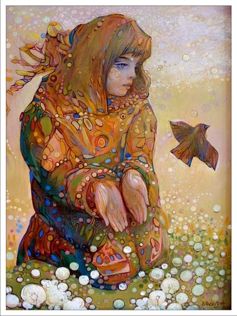 До самых похорон Люн много плакала. В душе была пустота, и ничем не хотелось заниматься, не за кем было ухаживать. Странное ощущение... Медленно возвращаясь домой с кладбища, она вдруг почувствовала, как что-то опустилось ей на голову. Девочка подняла руку и нащупала птицу. Это был жаворонок, только птичка была окрашена в самые необычные цвета. Люн взяла птичку в руки. Та не противилась и не пыталась улететь.