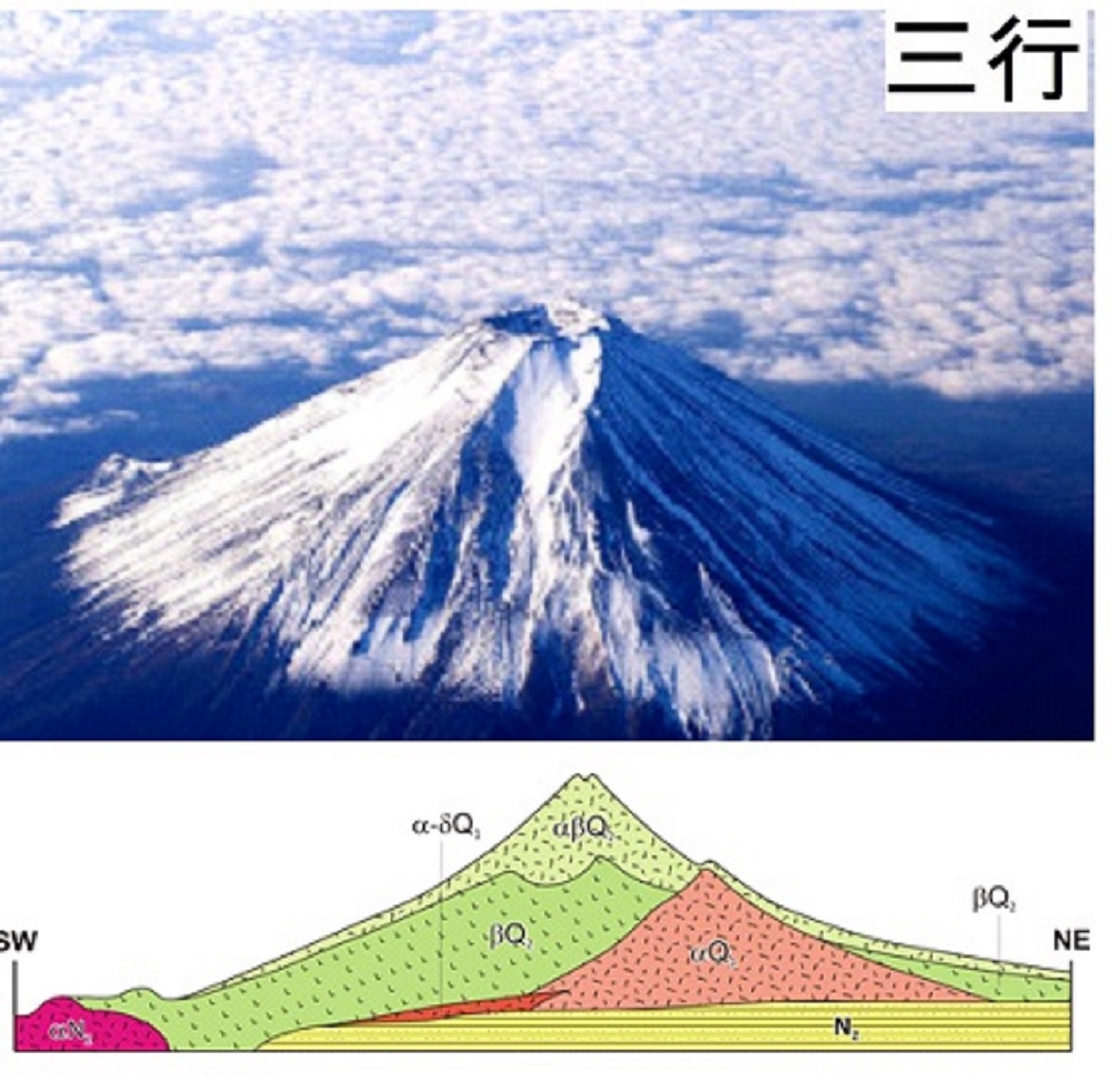 Илл. 2. Разрез Фудзи: N2 жёлтым – слоистые отложения среднего неогена, альфа N2 малиновым – внедрение магматических пород среднего неогена; альфа-бета Q1 коричневым – магматическая дайка нижнего плейстоцена; альфа Q1 розовым – первый вулкан нижнего плейстоцена, бета Q2 зелёным – второй вулкан среднего плейстоцена, альфа-дельта Q2 светло-зелёным – третий, ныне видимый вулкан с вулканитами разного состава. SW «юго-запад», NE «северо-восток».