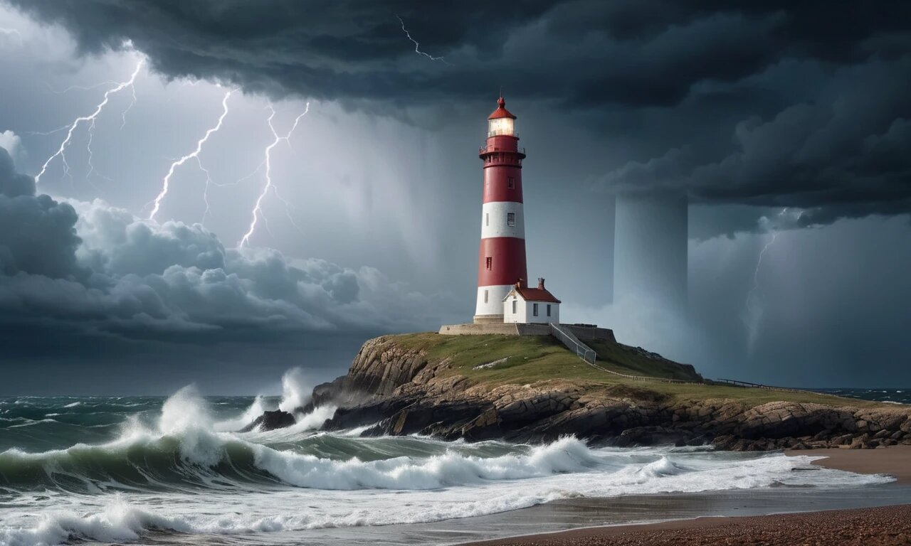 Пустынный берег с маяком,