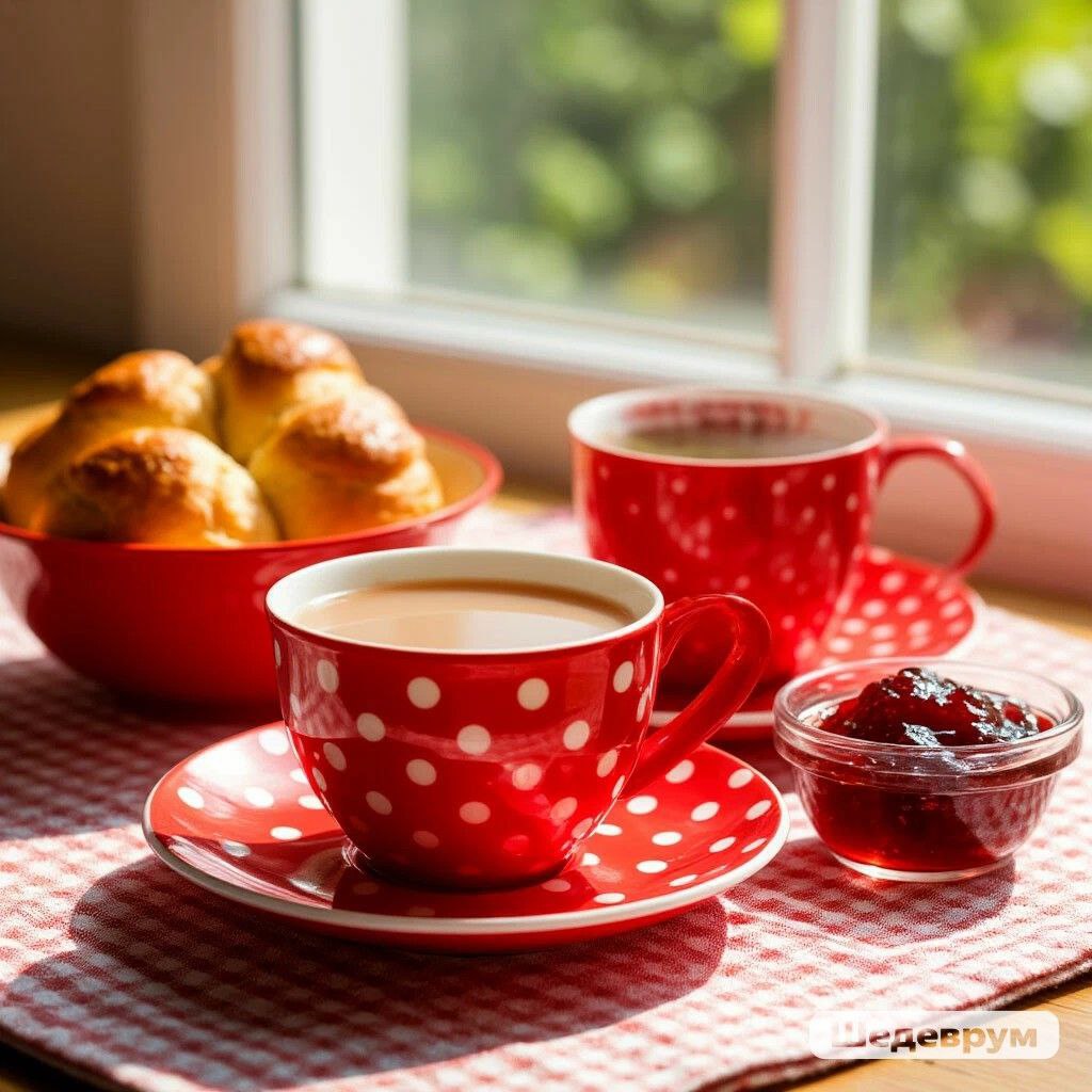 Чашка в горошек и чай с молоком..