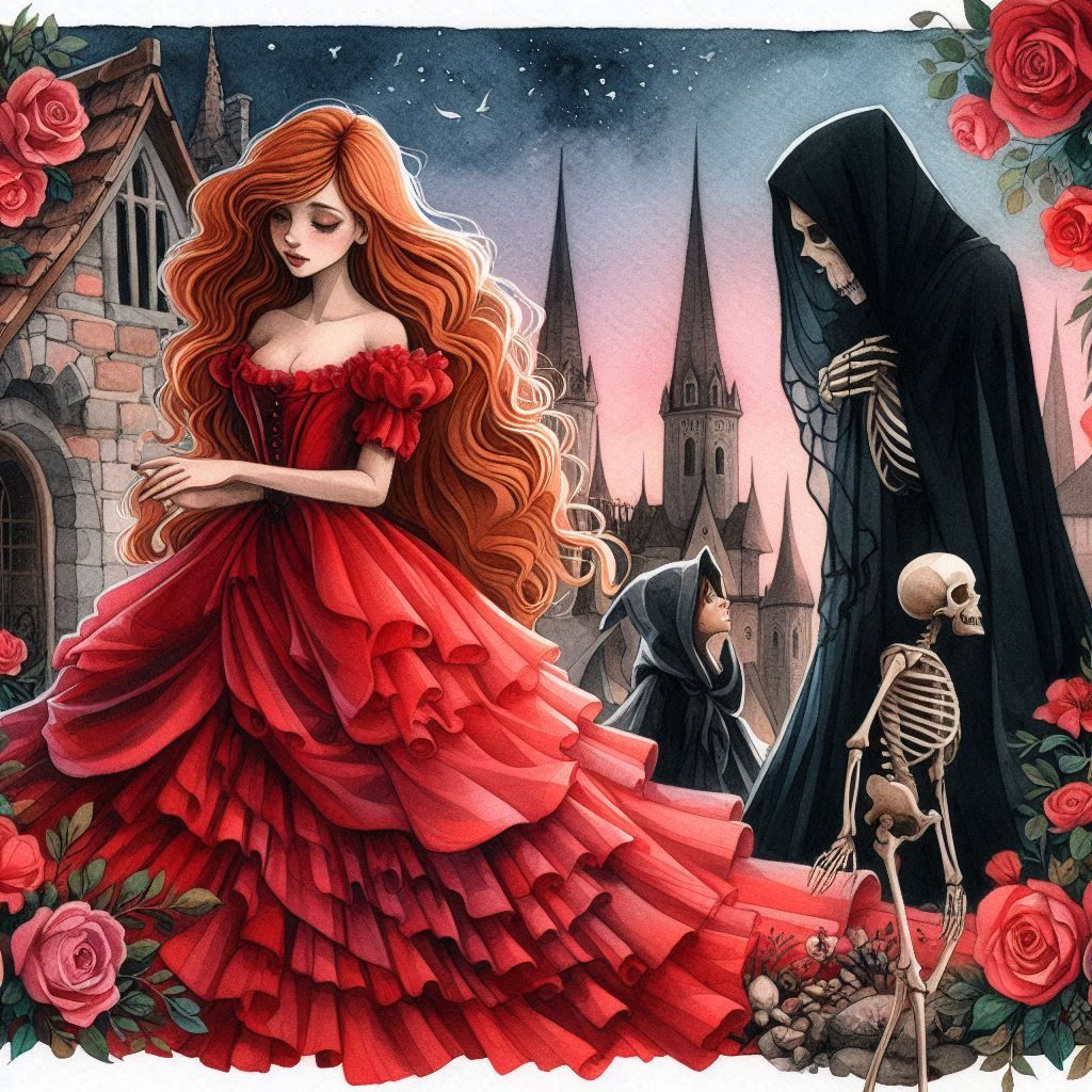Но Алла была смелой. Она шагнула дальше и увидела высокую фигуру в чёрном плаще. Это была сама Смерть — с костяным лицом и пустыми глазами. Рядом с ней стоял маленький скелет, который грустно смотрел на принцессу.