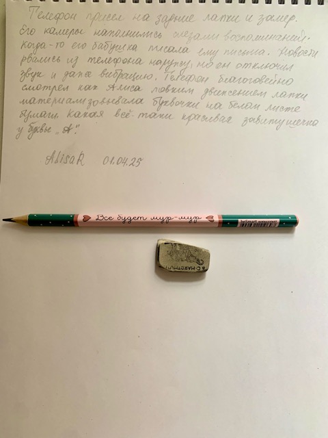 Телефон благоговейно смотрел как Алиса ловким движением лапки материализовывала буквочки на белом листе бумаги. Какая всё-таки красивая завитушечка у буквы «А».