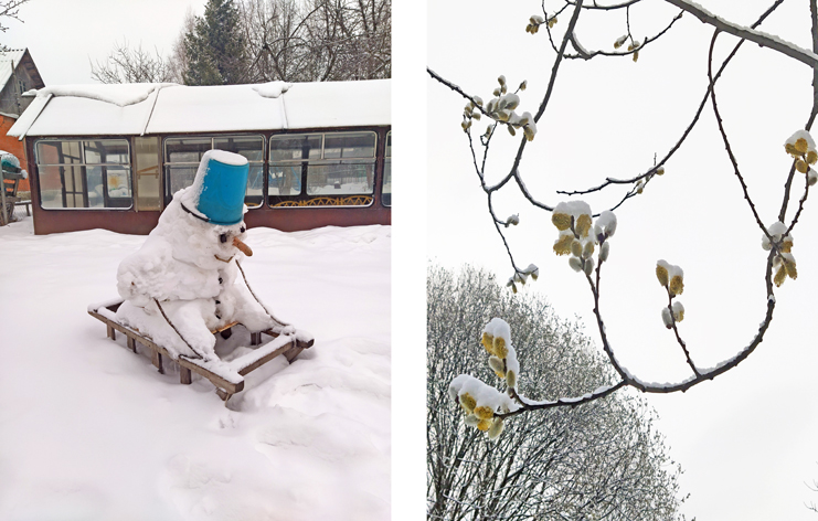 Фото Сергея Коробова – снеговик в деревне Куровское и цветущие ветки ивы в снеговом убранстве утром 9 апреля 2025 года