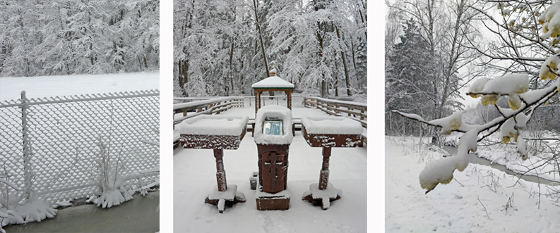 5 апреля было тепло, и первоцветы наполняли воздух весенней радостью. Но в ночь на 6-е число вьюга засыпала снегом всю округу. Снег был липкий и даже на сетке-рабице он выткал снежную вуаль. Скит на источнике преподобного Тихона Калужского предстал в безмолвии и сказочном одеянии. Всё было запорошено, даже под ноги не хотелось смотреть. Икона преподобного Тихона после аккуратной очистки предстала в белоснежном киоте. Молитвенный дух исходил от неё. По дороге в монастырь распустившиеся нежно-желтые почки ивы по обочинам, казалось, подмигивали мне через окно автомобиля. Я, конечно же, не мог не остановиться и не выразить им моё восхищение. На въезде в монастырь через северные врата обители шлагбаум от налипшего снега не смог подняться автоматически, и охраннику пришлось выходить и поднимать его вручную. Я подумал про шлагбаум – устал бедняга, а про охранника – богатырь, дал мне путь! Так монастырь в снежно-сказочном убранстве встретил меня перед Благовещением!
