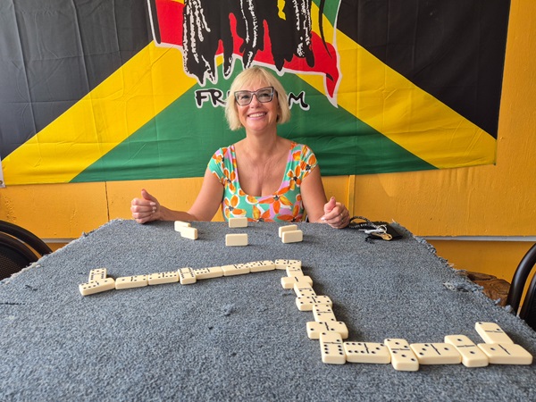 В баре пока никого нет и мы с мужем решили поиграть в домино, ещё здесь есть бильярдный стол и два стола для игры в домино.