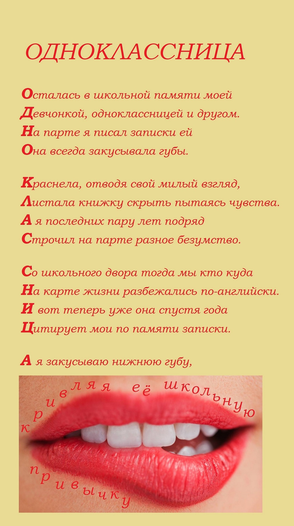 А/ я закусываю нижнюю губу, кривляя её школьную