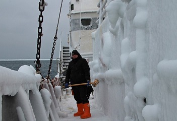 Бьющие по судну волны, сопровождаемые сильным ветром, шквалом брызг и низкой температурой, могут быть смертельной комбинацией. Без предупреждения, слой за слоем, лед неумолимо образуется на всем, куда попадают брызги, что приводит к гибели судна.В этой ситуации члены экипажа сбивают лёд с бортов и надстроек.