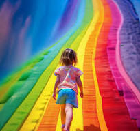 Внезапно дождь прекратился , и по всему огромному небу вспыхнула яркая, переливающаяся всеми цветами радуга. Один край её уперся прямо в окно, в которое смотрела девочка. Она открыла створку, хотя папа строго-настрого запрещал ей это делать, и протянула руку к радуге. Это была прохладная на ощупь цветная дорожка.