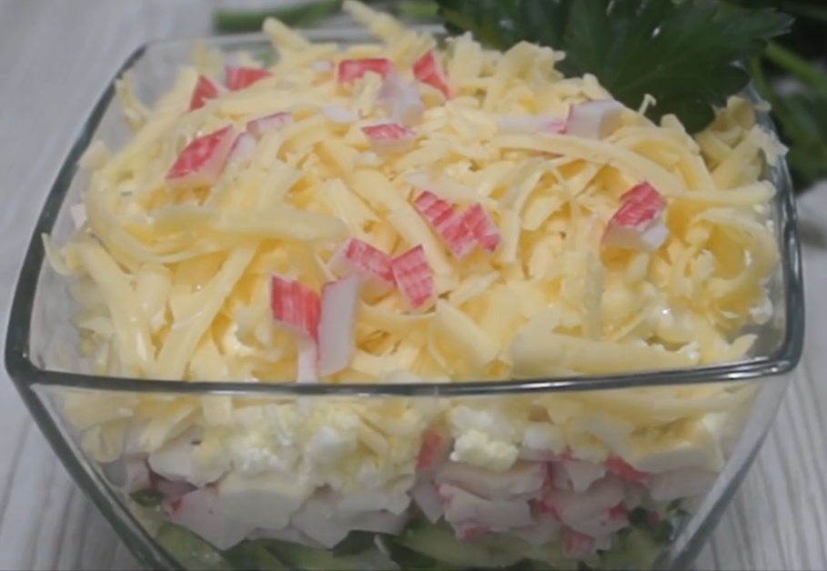 4 слой - равномерно посыпаем верх тертым сыром. Сверху можно украсить зеленью и крабовой палочкой.