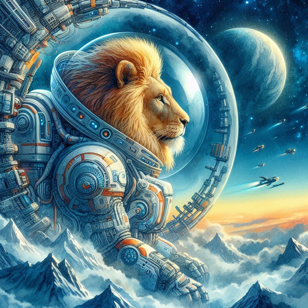 На далекой планете Астра, где небосвод переливался всеми цветами радуги, а горы вздымались к самым звездам острыми пиками, жил наш герой по имени Руслан. Нет, он не был отважным рыцарем или могущественным волшебником, хотя в его глазах горел огонек приключений, достойный лучших героев сказок. Руслан был… львом. Да-да, самым настоящим львом, но не простым. Он носил сверкающий скафандр, словно сотканный из лунного света и звездной пыли, а его густая золотистая грива развевалась даже в безвоздушном пространстве, словно повинуясь невидимому ветру далеких галактик.