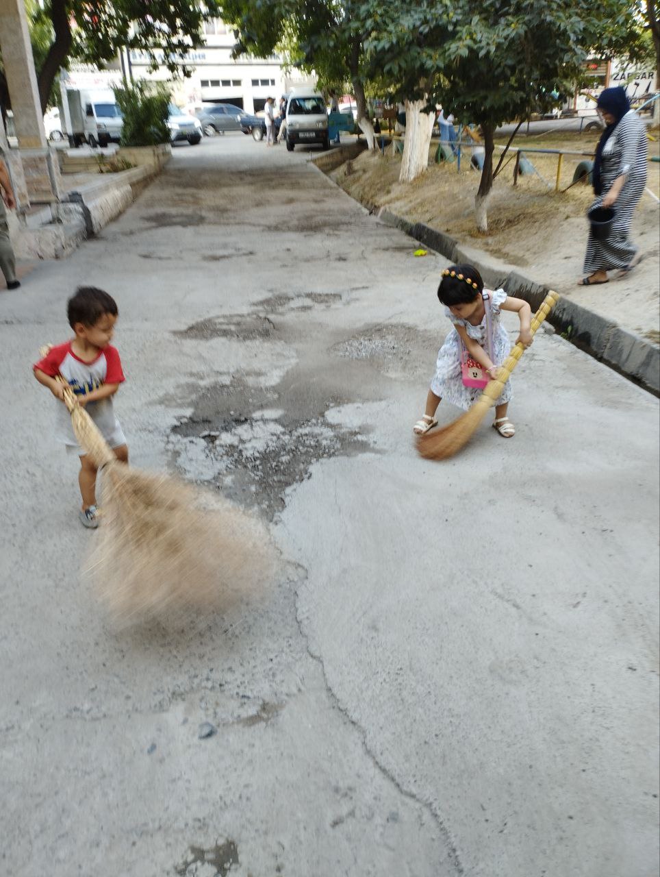 На уборке малыши подметают от души.