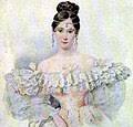 В «непечатных» биографиях 60-х годов прошлого века, она была белокурой с рыжеватым «солнечным» оттенком копной волос а – ля Помпадур. Причёска Помпадур в 19 веке, высокий начёс волос, пример, её портрет художника А. Брюллова, где ещё не исполнилось 18 лет.
