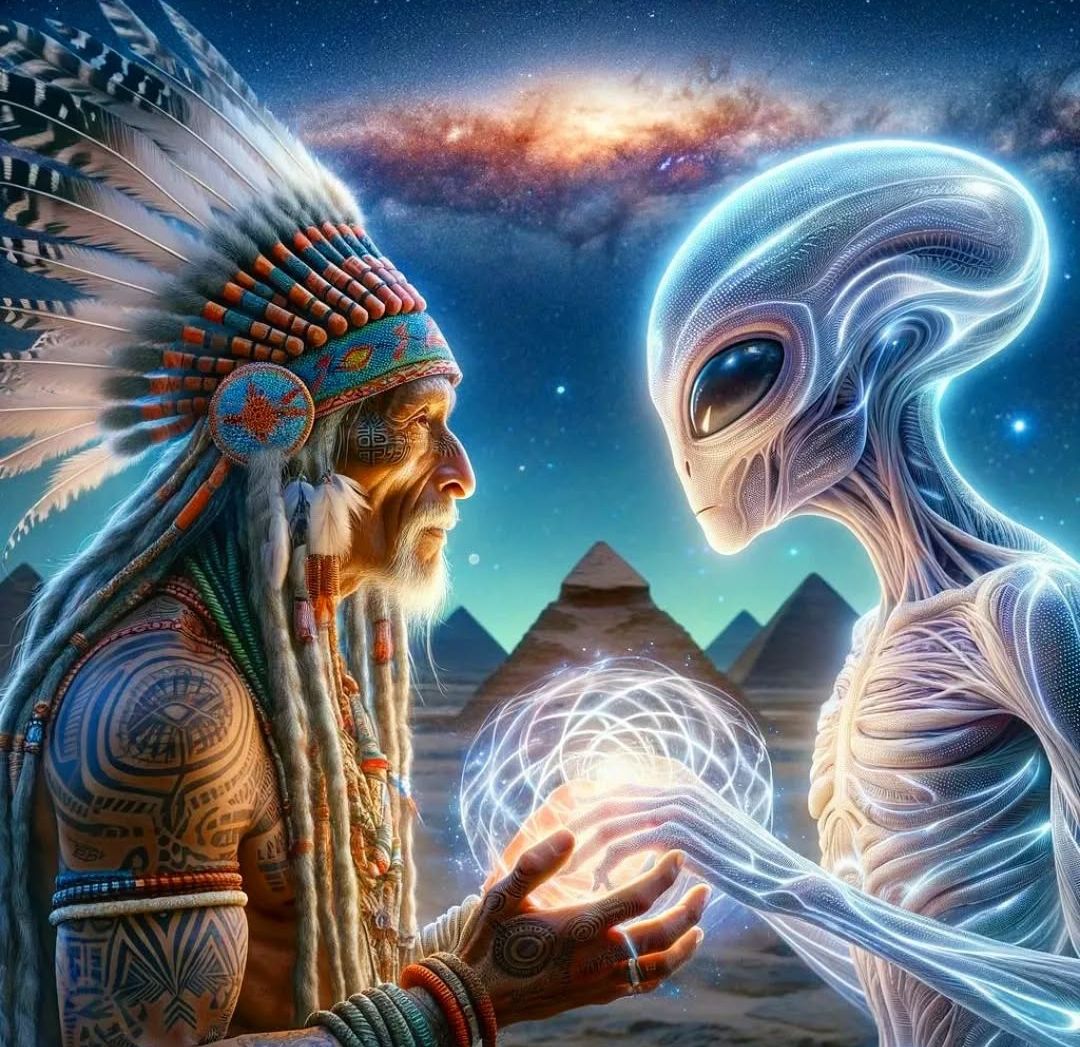 В центре пирамидального комплекса, в том самом месте, которое Олег и Наташа видели на голограмме Элары, ждал древний индейский вождь. Он был облачен в традиционные перья и наряды, его лицо было изрезано морщинами, а глаза светились мудростью веков. Рядом с ним стоял один из ксеносцев, похожий на Элару, но гораздо старше.