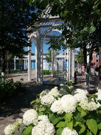 В сквер. В гортензиях он утопает.