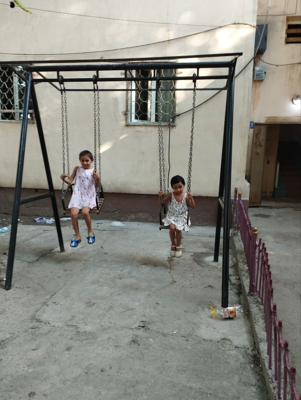и свои высокие деревянные качели-