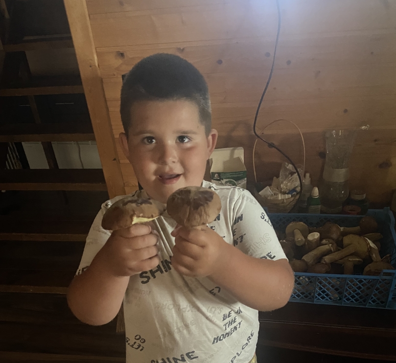 Матвей держит два гриба.