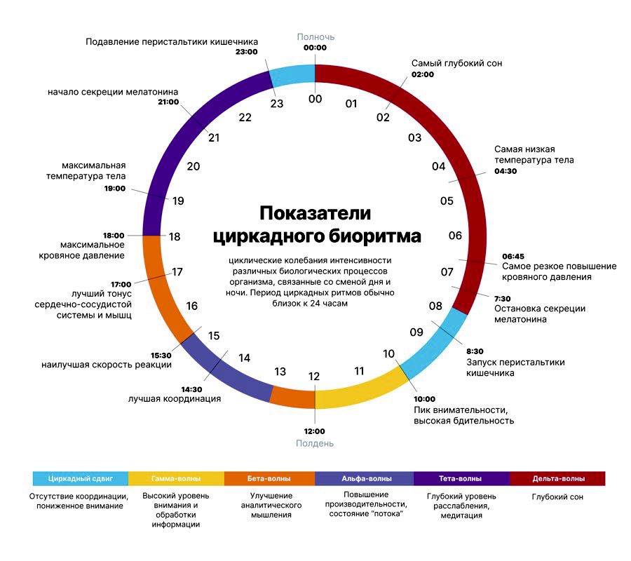 |2:00 – 4:00| **Мелатонин** (тоже пик выработки) – глубокий сон,