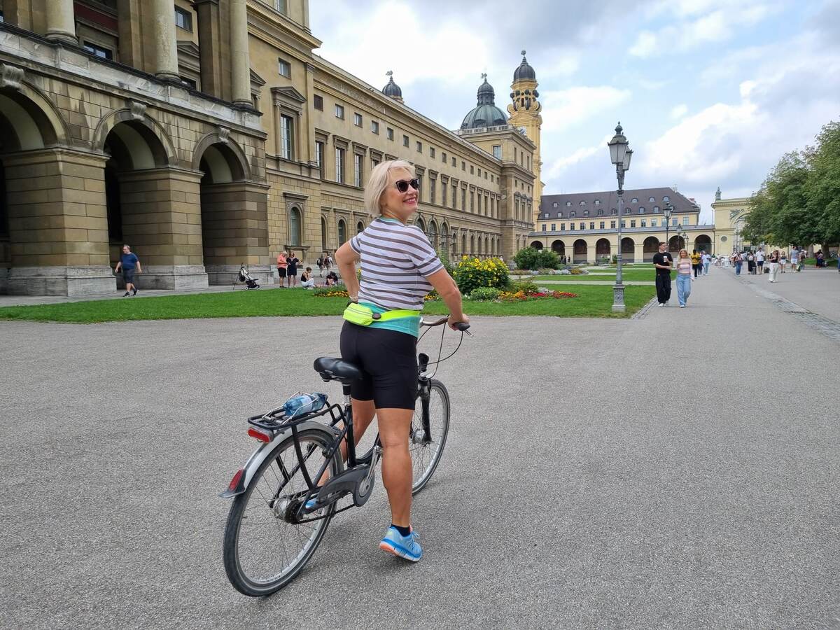 Мы едем по городу: вот Одеонсплац - надо сфотографироваться, а как же иначе, тут начинается обычно старт акции “Ночь велосипедистов” ссылка, а так же проходят разные демонстрации и масштабные мероприятия. Мы с мужем участвовали в одном таком проекте - фотоинсталляции “Кольцо Нибелунгов”, когда на площади в дополнение к постоянным монументам, возникли живые монументальные фигуры из обнаженных людей, намазанных красной и золотой краской ссылка.