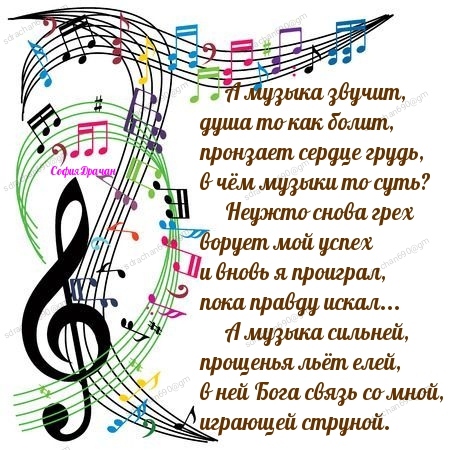 Да,София,дорогая,музыка так может пронять,так зазвучать струнами сердца,так помочь понять себя,свои промахи и свои радости! Слава прекрасной Музыке!!! С уважением.Благодарю!!!