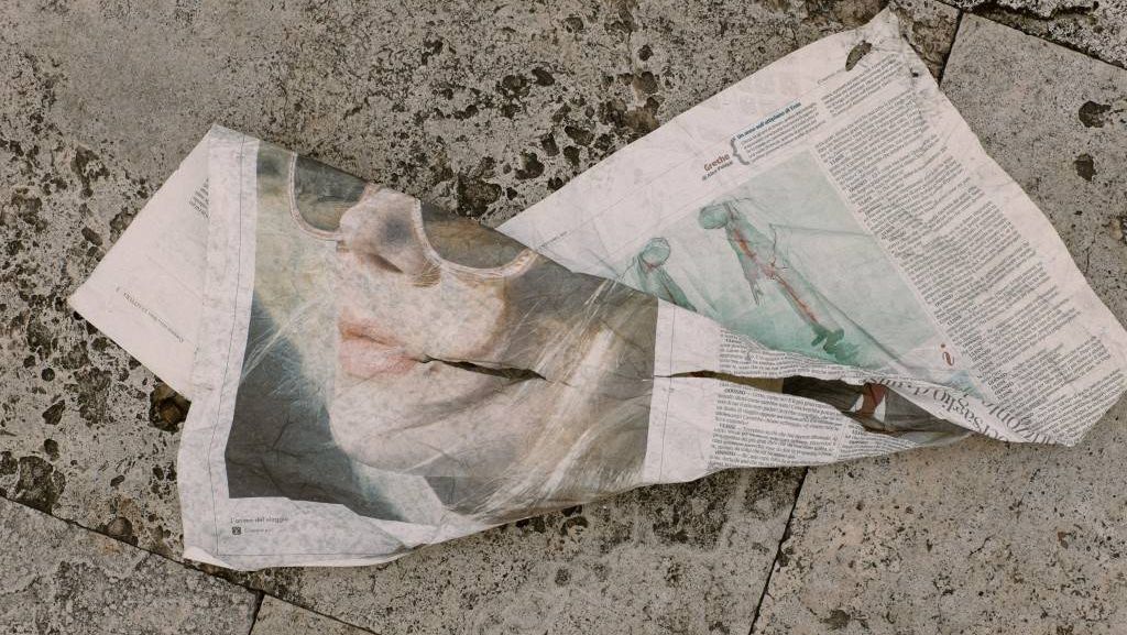 в серо-мятую газету,