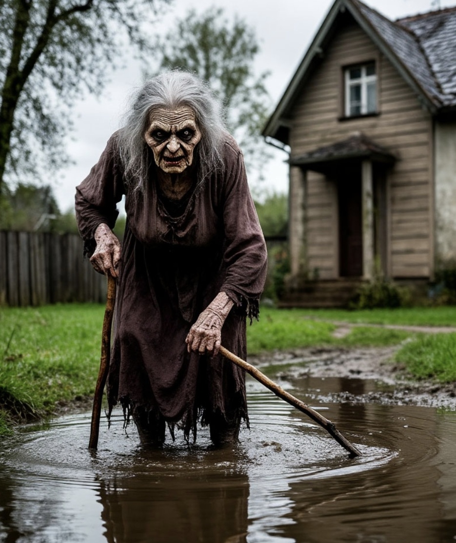 а страшной старухой, костлявой, седой, с горбом,