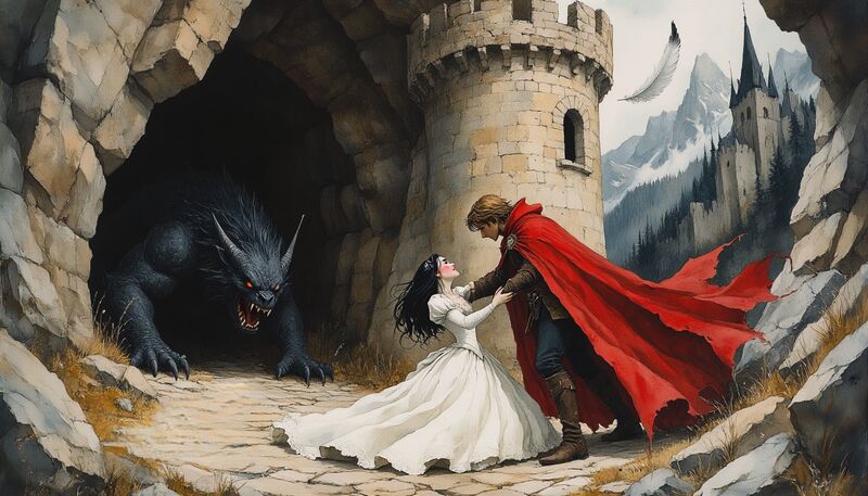 Но как раз в этот год жребий упал на дом принцессы. Её отец не захотел отдавать дочь в жертву. Он подкараулил молодого принца, заточил его в неприступную башню возле пещеры чудовища, чтоб скормить чудовищу вместо дочки. Наступила Ночь Жертвы, и Чудовище уже появилось из пещеры и направилось к башне…