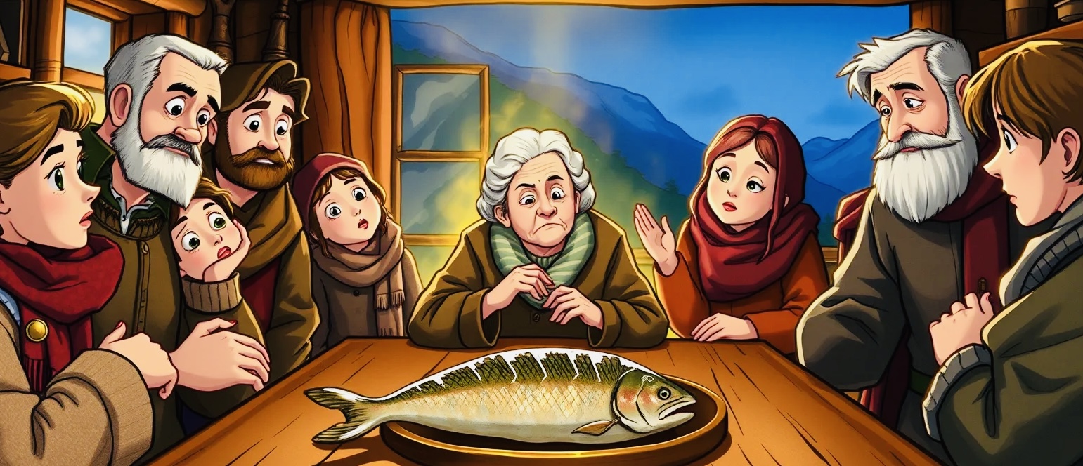 Когда же семья, успокоенная и благодарная, вернулась под родной кров, едва переступив порог, бабушка, чьи щёки ещё хранили бледность пережитого, оглядела стол и твёрдо спросила: «А где же мой кусок рыбы?»
