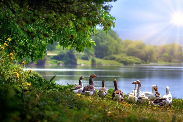 Вдруг какая-то птица тяжело опустилась в густую листву дуба... Поднимаем голову вверх, и вдруг над нашими головами раздался резкий, пронзительный крик сойки. Услужливое эхо сразу разнесло его свист далеко по заливу. Напрасно мы старалась притаиться: вся стая гусей остановилась, будто по команде, а вожак резко приподнялся над водою, тревожно огляделся вокруг и что-то быстро загоготал, обратившись к стае. Как на зло в это самое мгновение что-то ещё прошмыгнуло из густых кустов и прямо наткнулось на гусей, которые уже стали поворачивать в сторону озера. Испуганные гуси с криком поднялись над заливом и потянулись вереницей куда-то вдаль по-над лесом, громко крича. Их крик с грохотом разнесся переливами в лесной чаще, отдался звучным эхом далеко на озере. Лес встрепенулся тысячью разнообразных птичьих голосов, а над заливом, без преувеличения, тучей поднялись ещё и стаи уток, закружились в вышине и торопливо понеслись на озеро. А мы, весело смеясь, вернулись к месту нашей стоянки, чтобы рассказать о нашем приключении...