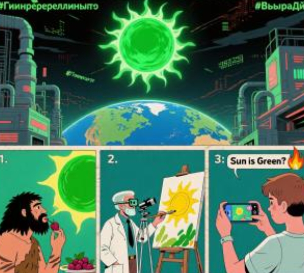 · Акт первый. Доисторический. Первобытный человек (Homo Incuriosus). Видит зеленое солнце. "Хм, — думает он, — трава зеленая, солнце зеленое... возможно, солнце — это просто очень большая трава, которая горит. Логично. Пойду съем эту зеленую ягоду". Естественный отбор проводит жесткий ребрендинг восприятия. Выживают те, кто видит солнце теплым и предупреждающим, то есть желтым/оранжевым.