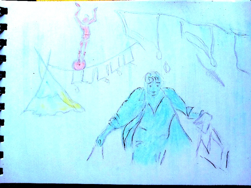 Радужные капли дождя,перемешанные с краской текли тонкими ручьями к ногам Пабло(смывая его картины),а фортуна ,балансируя
