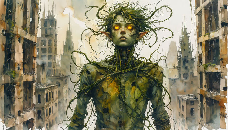 — Вообще-то, — вдруг сказал он, словно читая ее мысли и при этом ловко перепрыгивая через поваленные балки, —Не такой уж ты и деликатес. Да и я давно не ем в обычном понимании этого слова, и тут он ей лихо подмигнул.- Когда-то я был обычным учёным. Теперь вот — ходячая энциклопедия с лианами на голове. Забавно, правда?