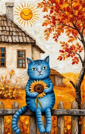 на заборе кот сидит, -