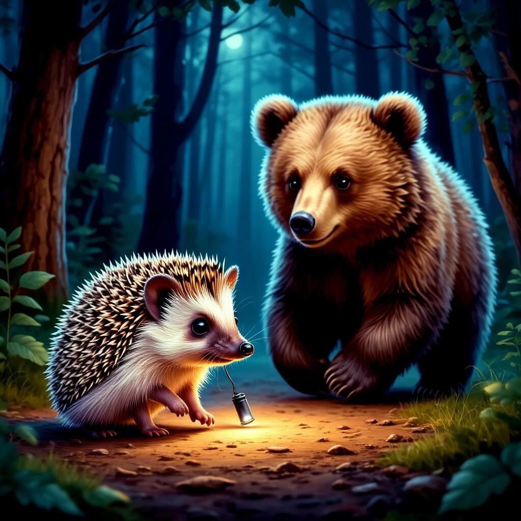 Ёжик взглянул снизу на медвежонка,