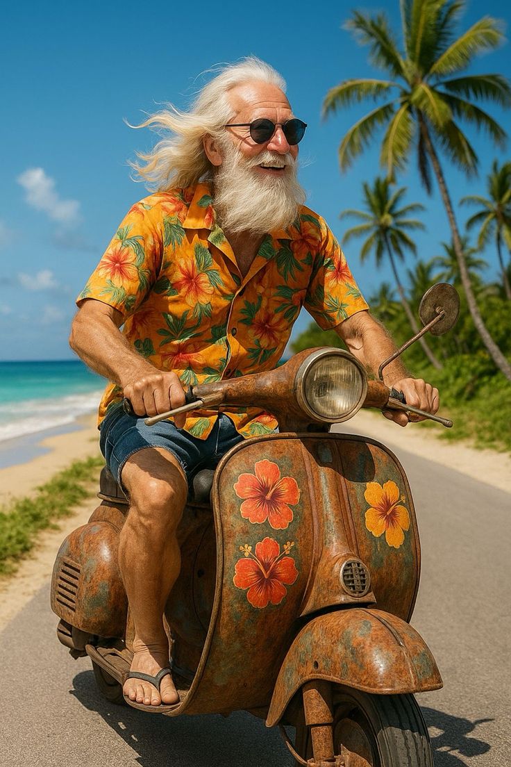 Весь в пляжном антураже.