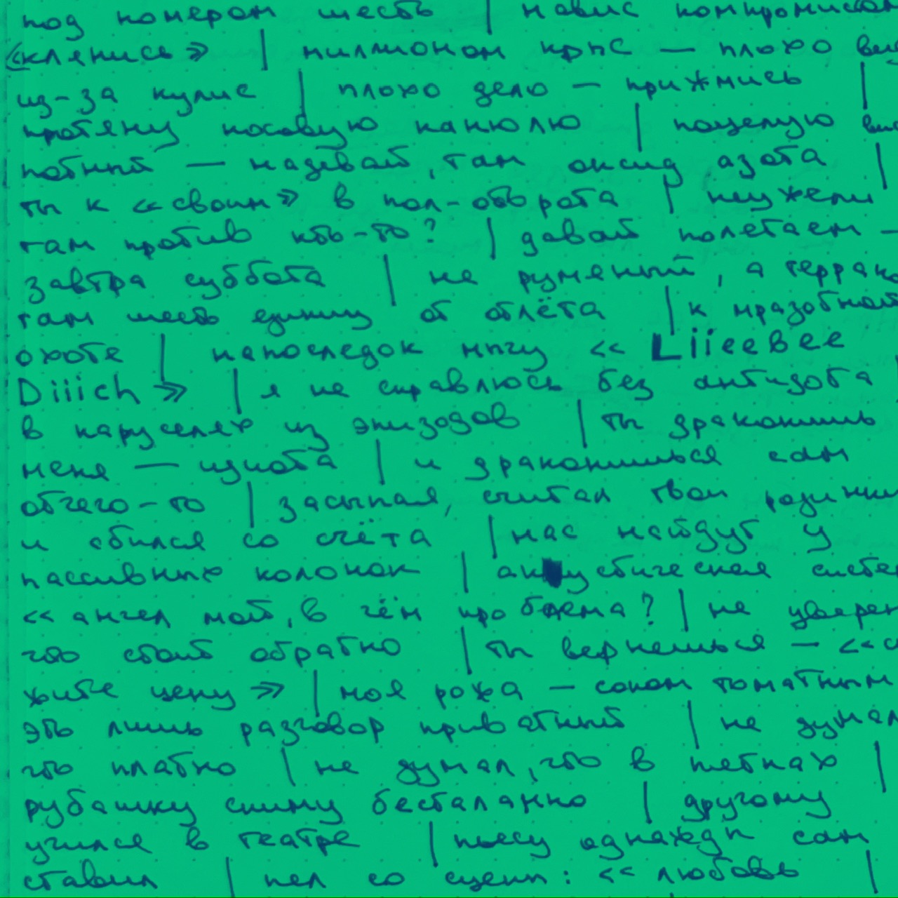 на «раз» ходит князь | влюблённых масть | Ваша честь — моя часть | моя грусть — Ваша напасть | моё «совпасть» — Ваша власть | там глазаст даже пенопласт | я же — мечтатель, фантаст | без ереванных астм | клыки — алебастр — зубаст | навис компромиссом — «клянись» | миллионом крыс — плохо видно из-за кулис | плохо дело — прижмись | протяну носовую канюлю | поцелую висок потный — надевай, там оксид азота | ты к «своим» в пол-оборота | неужели там против кто-то? | давай полетаем — завтра суббота | не румяный, а терракотовый | там шесть единиц от отлёта | к мразотной охоте | напоследок мычу: «Liieebee Diiich» | я не справлюсь без антидота | в каруселях из эпизодов | ты драконишь меня — идиота | и драконишься сам отчего-то | засыпая, считал твои родинки — и сбился со счёта | нас найдут у пассивных колонок | акустическая система — «ангел мой, в чём проблема?» | не уверен, что стоит обратно | ты вернёшься — «скажите цену» | моя рожа — соком томатным | это лишь разговор приватный | не думал, что платно | не думал, что в пятнах | рубашку сниму бесталанно | другому учился в театре | пьесу однажды сам ставил | пел со сцены: «любовь | зачем ты мучаешь меня?» | вопрос оживёт на твой запах | страницы романа — боль прошедшего марта | ты оригами скрутишь из моих суставов | ты кровожаден до дурости | досадна развратность | я тебя — разным | ты меня — неадекватно | очи стаду завяжет стервятник | без оглядки в осадках венерьих | кто кого злее? | играй перед публикой, а не моим доверием | тебе было за восемнадцать | в мой день рождения | точка зрения — точишь меч и готовишь зрелище | вечность подлил в Ваш фужер | капля красит — прицел | торс — простреленный | не покажут по телеку | как тонул. нёс ношу Офелии | вторить Шекспиру герой осмелился: