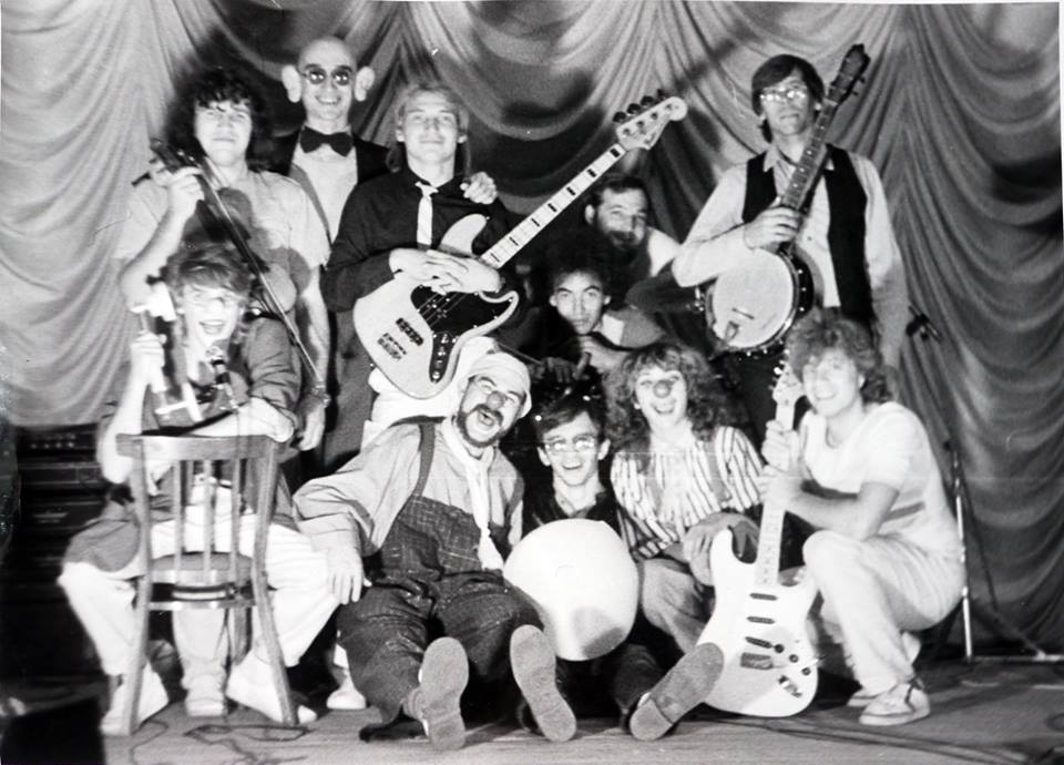 Потом через несколько песен по авансцене из одной кулисы в другую вдруг сами собой важно прошагали большие зелёные клоунские ботинки. Зрителям этого не было заметно за возвышающимся краем сцены, а мы-то на сцене их видели хорошо, не видно было только верёвок за которые их тянули и выглядело это как шагающий человек-невидимка. Это опять вызвало только улыбки и никто не «раскололся».
