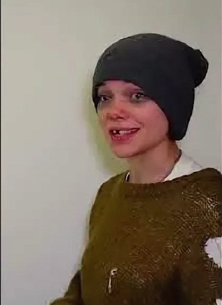 Она в явном похмелье, в рваной одежде,