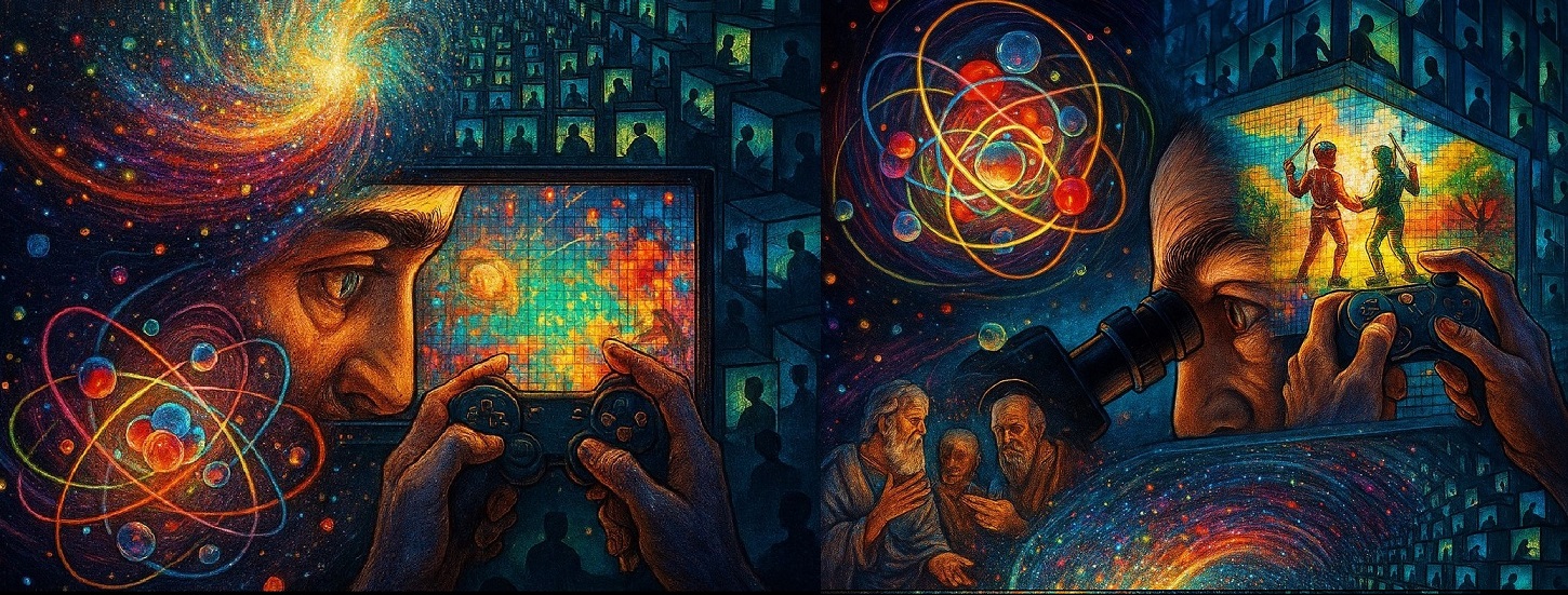 Камера снова как бы отъезжает назад, картинка ещё шире масштабируется и всё происходящее мы уже видим на мониторе компьютера. Это лишь игра, все её персонажи – виртуальные; ими, как марионетками на нитках, управляет клавиатура, послушная пальцам сидящего за компьютером игрока. Но марионетки в своём виртуальном мирке этого не знают. В их представлении вокруг них – безмерная вселенная, тайны которой они с апломбом постигают… На лице игрока-кукловода – довольные ухмылка. Он-то точно знает, где реальность.зарыта.