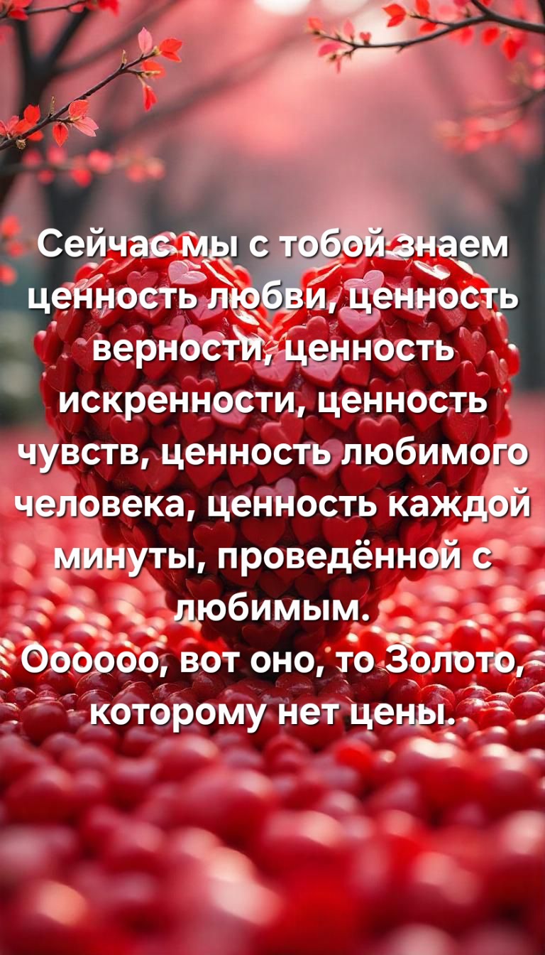 Сейчас мы с тобой знаем ценность любви, ценность верности, ценность искренности, ценность чувств, ценность любимого человека, ценность каждой минуты, проведённой с любимым.