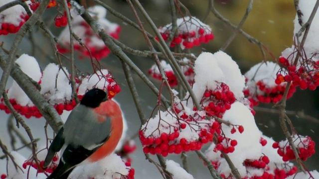 На ветвях снегири.
