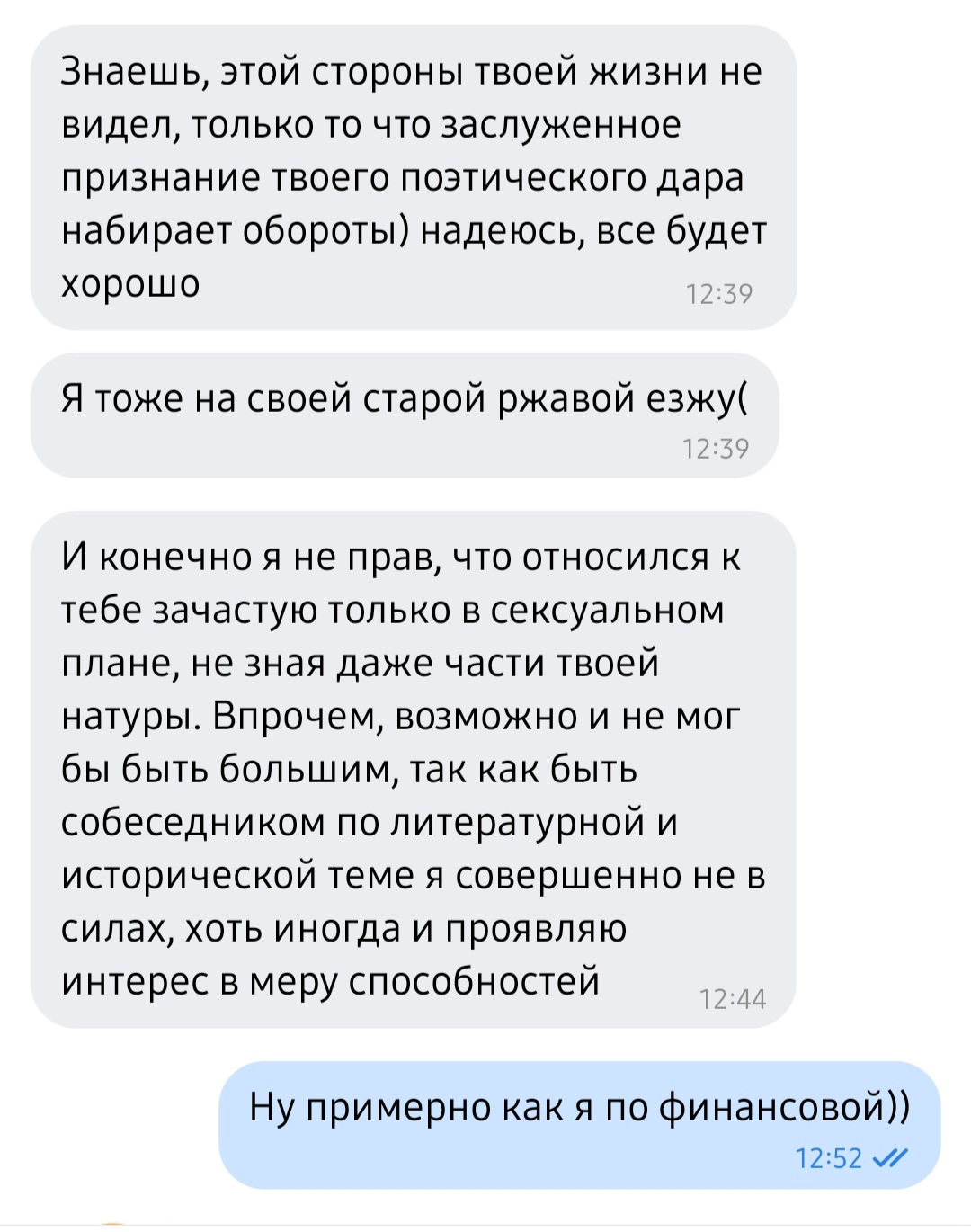 "А я считал виноватым себя. Как ты тогда сказала – избалованным жизнью, "пресыщенным"...