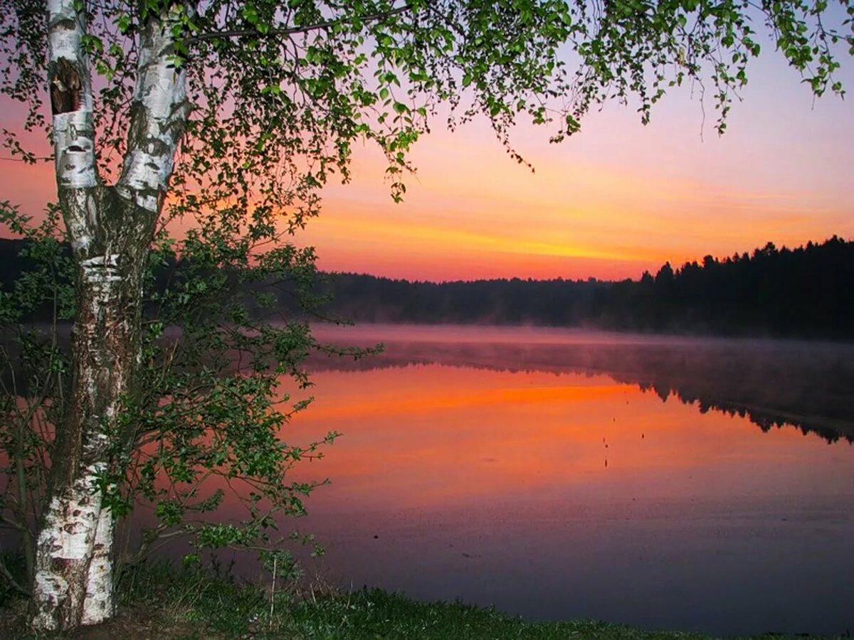 На берегу берёза стоит свесив косы,