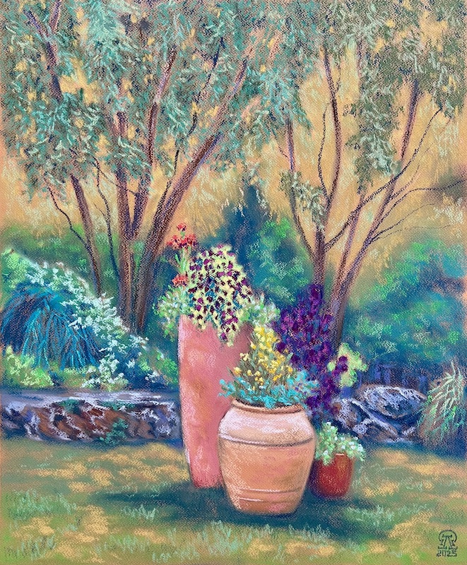 На фото работа автора. Садовая керамика. Бумага, пастель. 60х50 см. 2025 г.